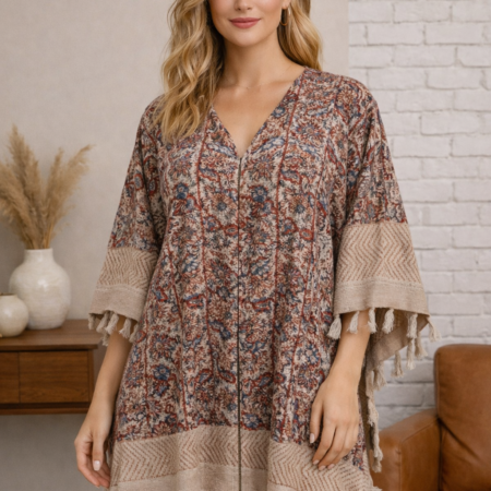 Boho Printed Short Handloom Kimono |Women's Embroidered Flared Sleeves Thread Work Handloom Kaftan | Heritage Aari Embroidery Kaftan Kimono