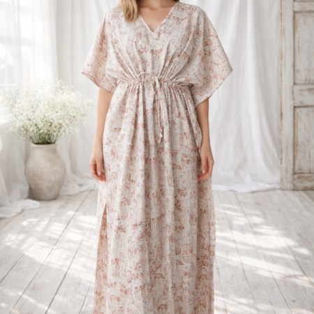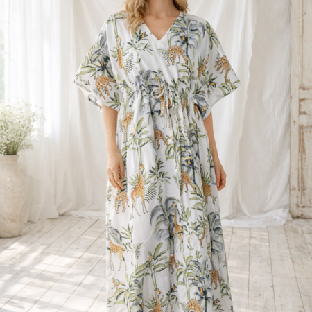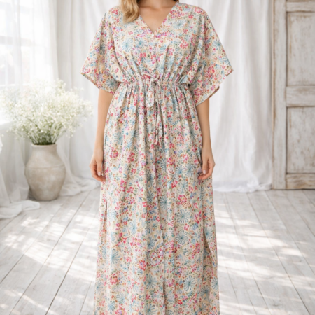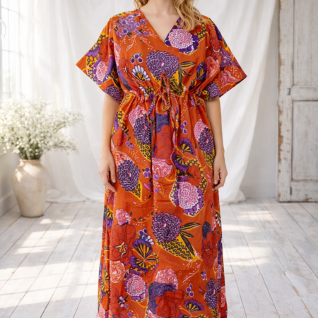 Hand Block Print Floral Kaftan - 100% Cotton Night Dress - Bohemian Sleepwear Gown - Long Lounge Maxi - Comfortable House Dress - Indian Caftan