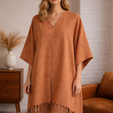 Embroidered Floral Handloom Kimono: Peach Short Kaftan Dress