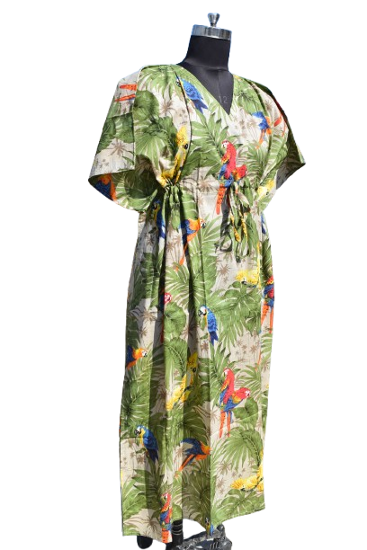 Indian Hand Block Print Floral Cotton Kaftan Dress – Women’s Long Beach Cover-Up, Sleepwear, Loungewear, and Maxi Dress with Adjustable Drawstring Waist
